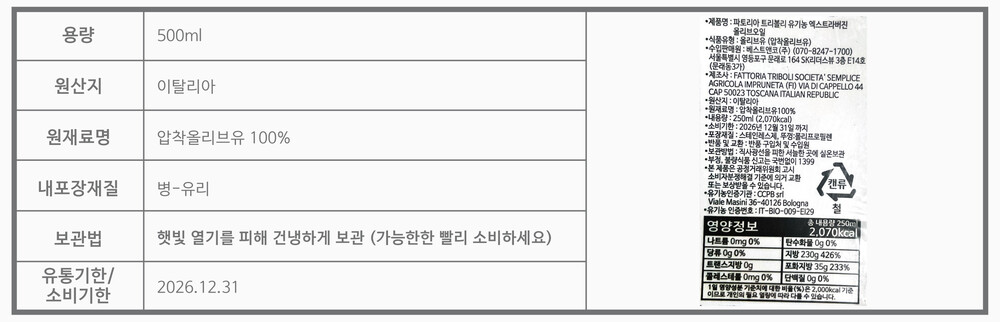 유기농 파토리아 트리볼리 엑스트라버진 올리브오일 250ml
