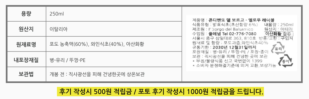 콘디멘토 델 보르고 옐로우 발사믹 3년 숙성 100ml