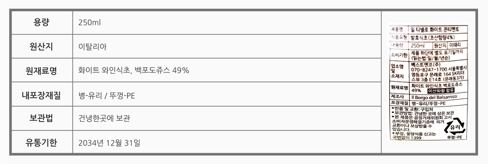 일 티넬로 콘디멘토 블랑코 화이트 발사믹 250ml