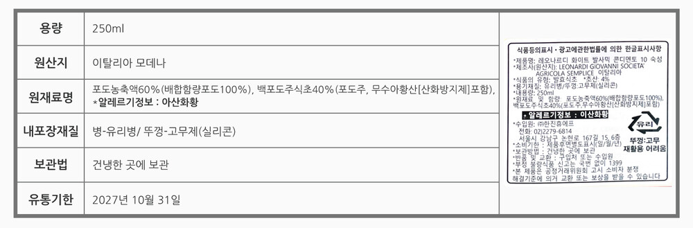 레오나르디 화이트 발사믹 10년 숙성 250ml